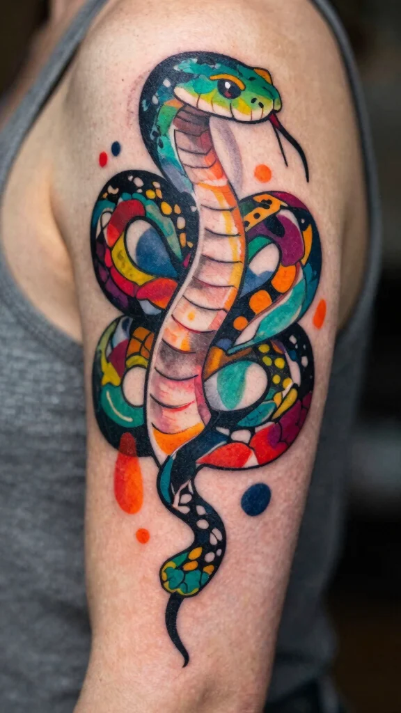 Abstract snake tattoos provide a modern twist on traditional designs, encouraging creative expression. These tattoos often break away from realistic portrayals, using colors and shapes to convey personal meaning. This style offers bold artistic freedom, allowing wearers to stand out and showcase individuality.