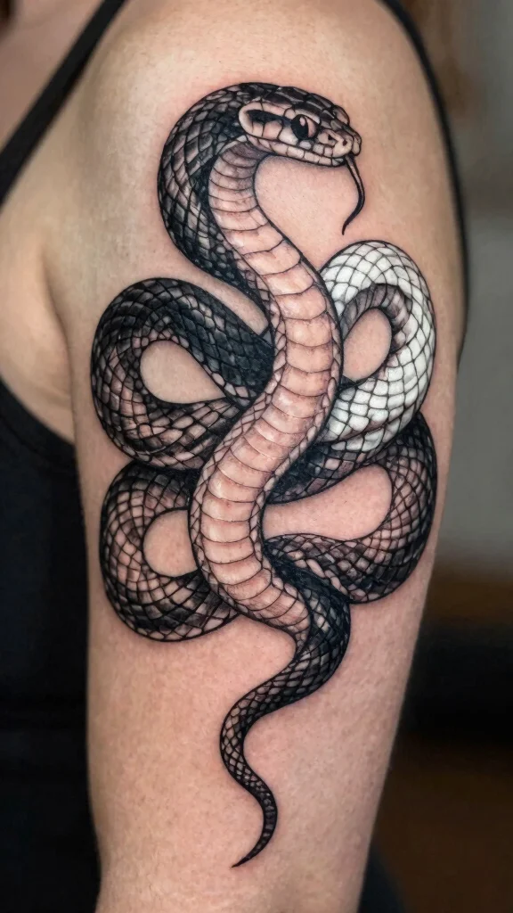 Snakes often embody the theme of duality, representing both creation and destruction. A dual snake tattoo showcases two entwined serpents, beautifully illustrating the balance between opposing forces. This design can be strikingly illustrated with contrasting colors, such as black and white, or even in a yin-yang style that emphasizes harmony.