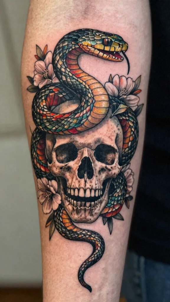A serpent entwined with a skull creates a captivating tattoo that speaks to themes of mortality and wisdom. This design serves as a poignant reminder of life’s fleeting nature and the insights gained through experiences. The snake can be illustrated slithering through or wrapping around the skull, allowing for a variety of artistic interpretations.