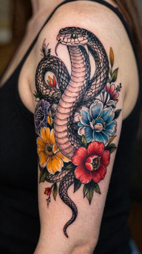 A serpent entwined with flowers creates a stunning tattoo that embodies love, growth, and transformation. This design symbolizes the harmony between life and death, where flowers represent new beginnings and snakes symbolize change. With a variety of styles, from delicate watercolors to intricate line work, this tattoo can be tailored to your preference.