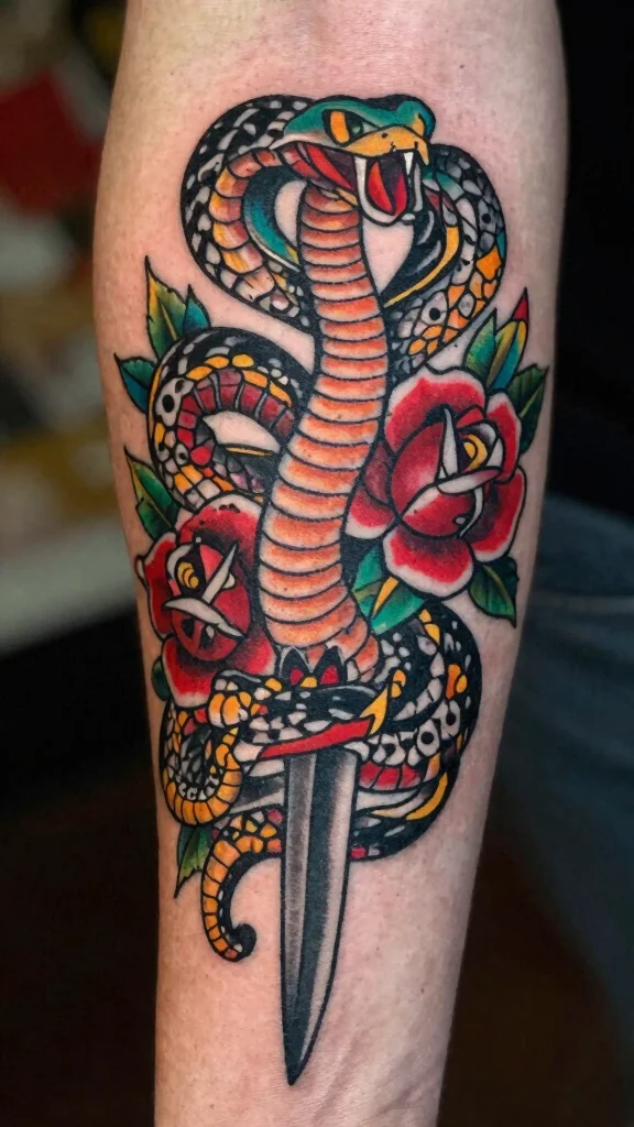 A vintage-style snake tattoo evokes nostalgia, drawing inspiration from traditional tattoo artistry. With bold outlines and vibrant colors, these tattoos often feature classic motifs like roses or daggers alongside the serpent. This design reflects an adventurous spirit and a love for exploration.