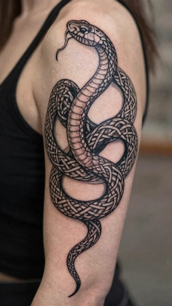 Celtic snake tattoos blend ancient traditions with intricate designs and deep symbolism. In Celtic lore, snakes often represent wisdom, transformation, and healing, making this tattoo rich in meaning. The interwoven patterns resemble traditional knot designs, creating a captivating visual effect.