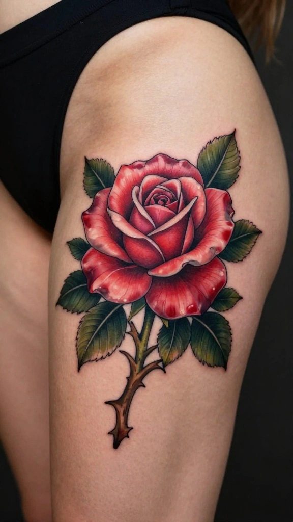 You’re drawn to roses for their deep meaning of love and beauty. A big thigh tattoo featuring roses can capture attention with its vibrant colors and intricate petal designs. Imagine the bold reds and soft pinks blending seamlessly, creating a stunning visual feast on your leg. This design not only enhances your thigh but also serves as a personal symbol of resilience and passion.