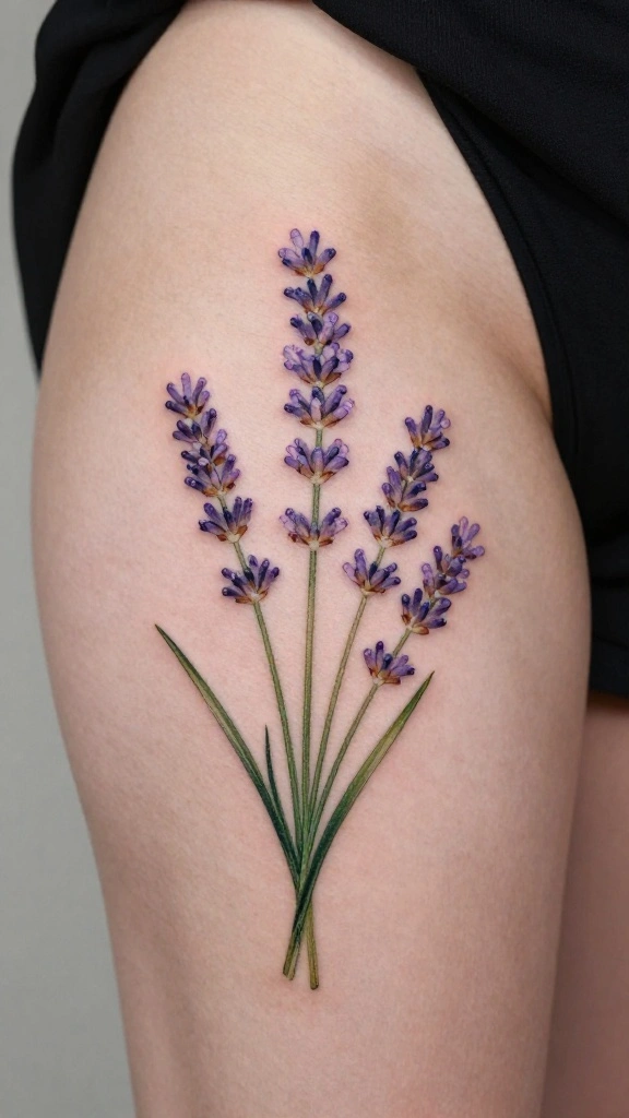 This lavender tattoo brings a sense of peace and beauty, transforming your thigh into a serene canvas.