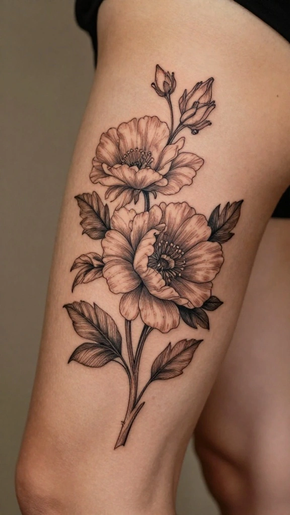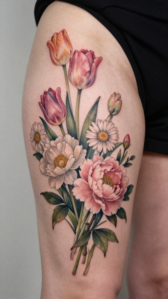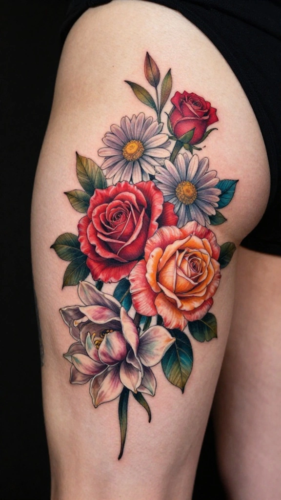 Opt for bright, saturated colors to ensure every detail pops, turning your thigh tattoo into a true work of art. You can mix different flower types for a more dynamic design.