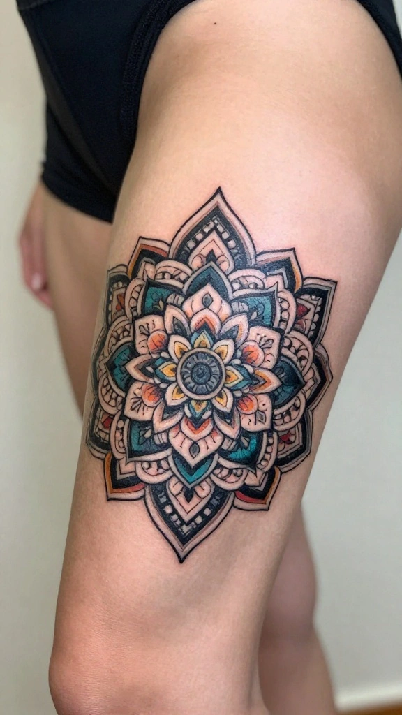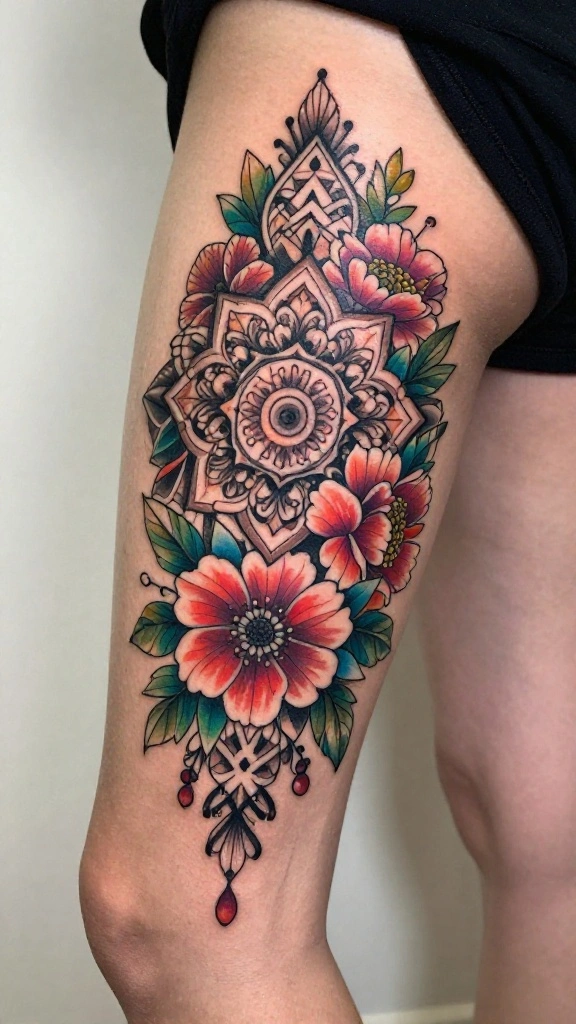 Mandala tattoos are known for their intricate designs and represent harmony and unity. A thigh tattoo that combines floral elements with mandala patterns creates a mesmerizing visual that captivates attention. Imagine a blooming flower at the center, surrounded by elaborate geometric shapes radiating outward, creating a stunning focal point. This style celebrates the beauty of symmetry and balance in body art.