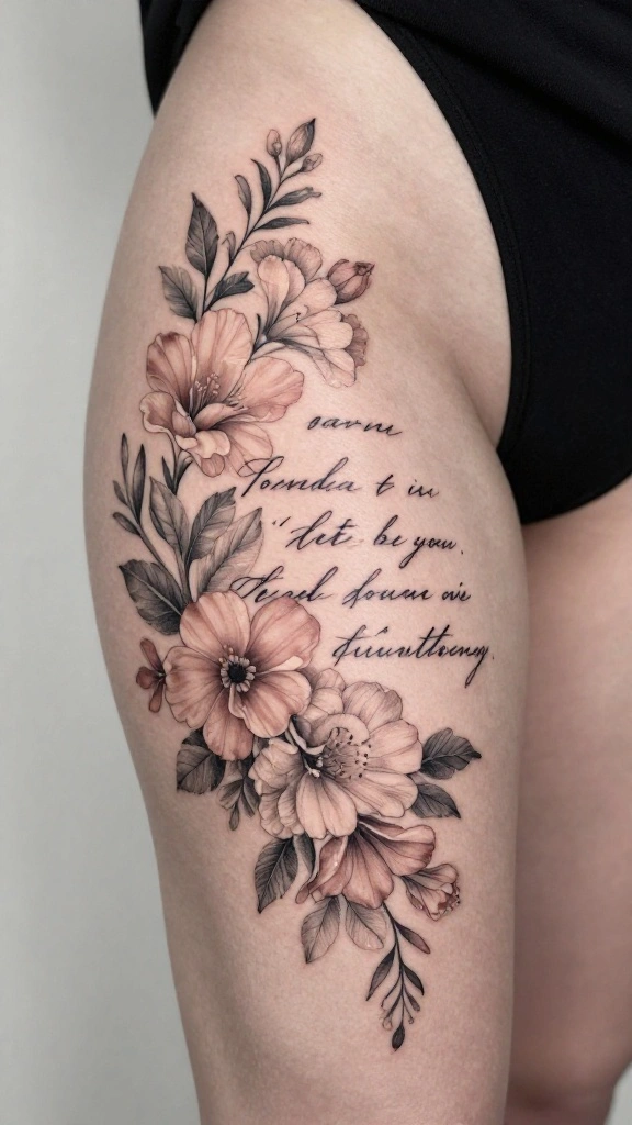 Incorporating quotes with floral designs adds significant meaning to thigh tattoos. Imagine a beautifully scripted quote surrounded by delicate flowers, creating a harmonious blend of text and art. This design can reflect personal values, inspirations, or cherished memories, making it deeply personal.