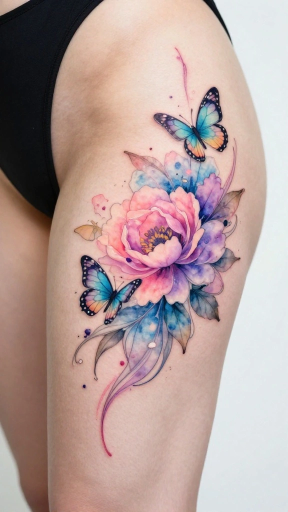 If you love artful tattoos, watercolor designs might capture your heart. A large thigh tattoo with watercolor flowers can produce a dreamy effect with colors blending softly, reminiscent of a serene sunrise. Imagine blues, pinks, and purples flowing together, creating an ethereal vibe. This design is perfect for those seeking a gentle, feminine touch in their body art.