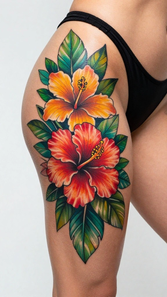 Tropical flowers like hibiscus and orchids bring a vibrant and exotic flair to thigh tattoos. Imagine a colorful arrangement of these flowers, perfect for those who want to make a bold statement. The designs can include lush green leaves and tropical elements, enhancing the overall feel of paradise. This style is ideal for adventurers and nature lovers looking to showcase their personality.