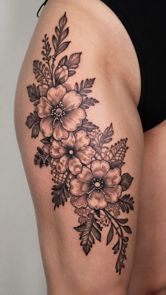 This tattoo design captures the beauty of lace and flowers, creating a visually stunning and meaningful piece on your thigh.