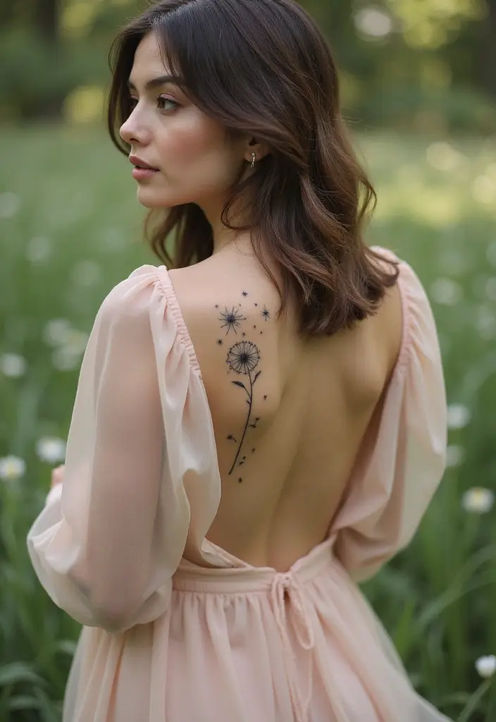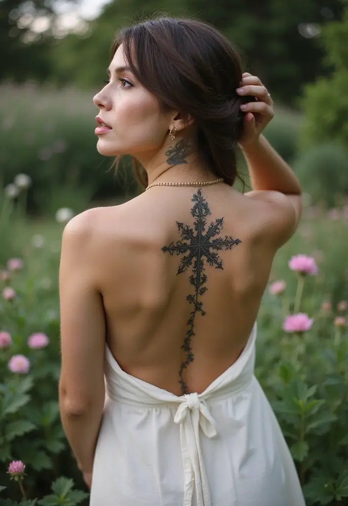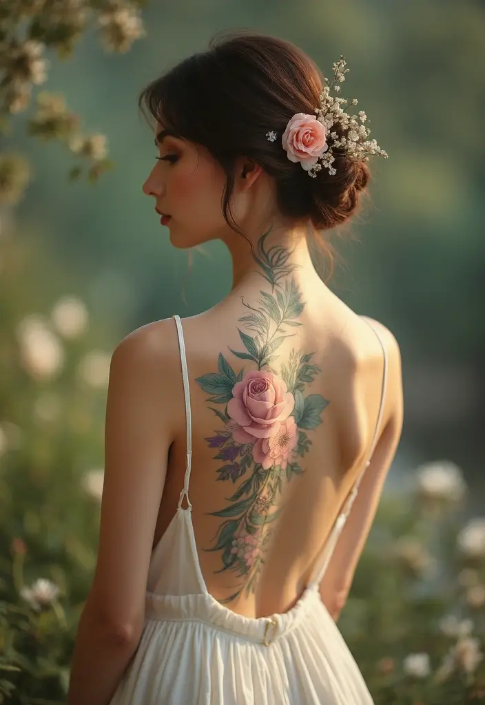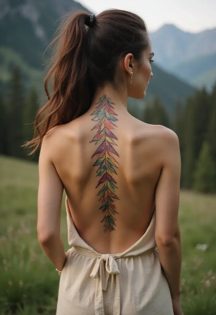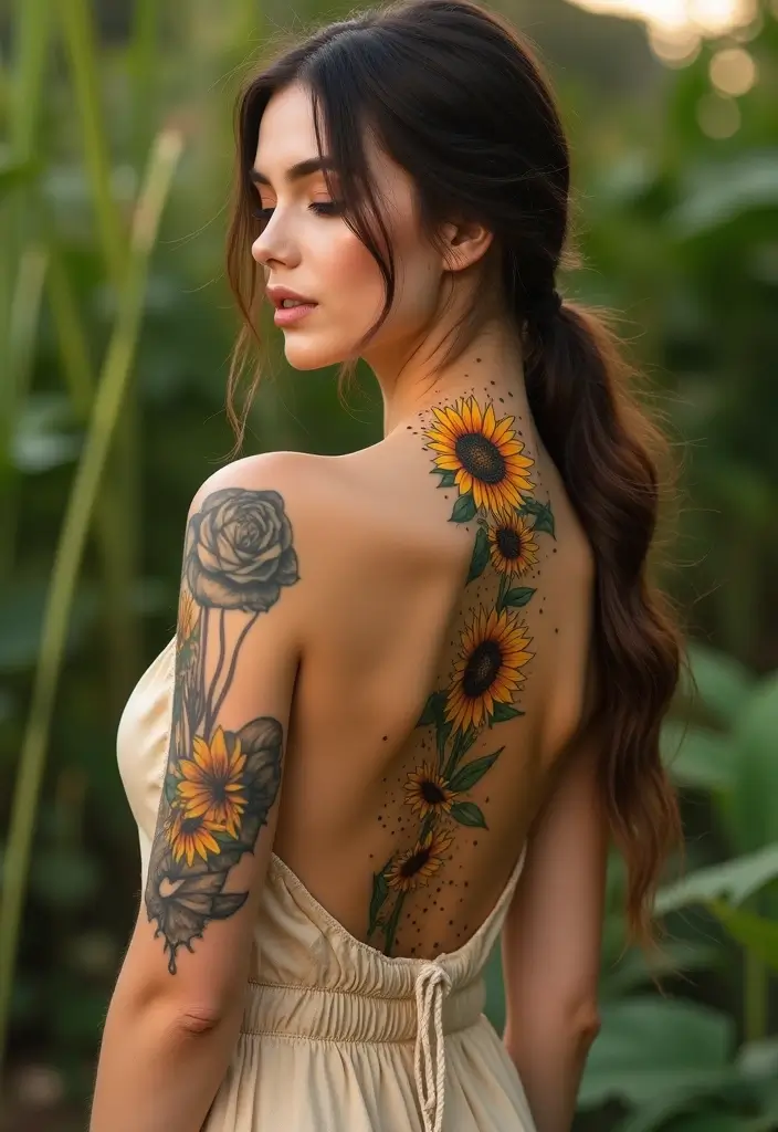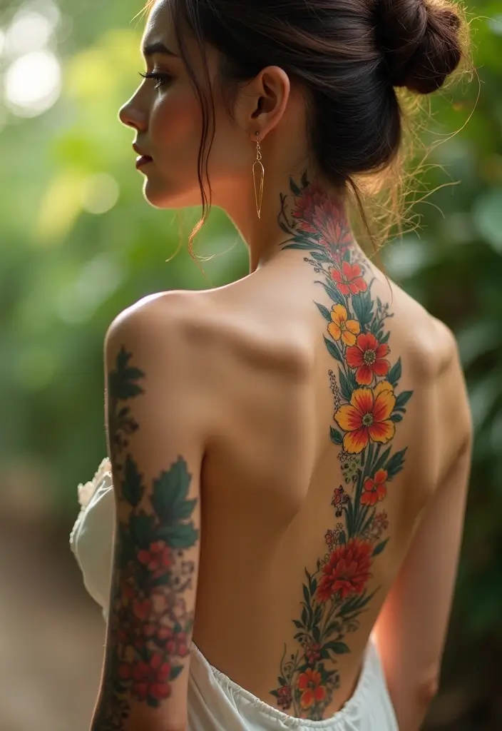 You want a spine tattoo that feels rustic and alive. Picture a line of wildflowers cascading down your back in yellows, purples, and pinks. The design nods to country life and its free, natural charm. Each bloom stands for a feeling, joy, love, resilience, so your skin tells a small story. The colors pop against your skin and catch the eye from across a room. Add tiny butterflies or bees among the petals to show a lively, busy ecosystem. This approach keeps the tattoo rooted in nature while still being easy to wear.
