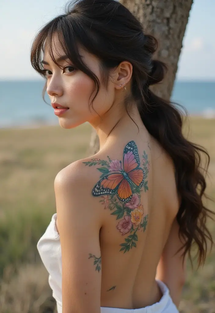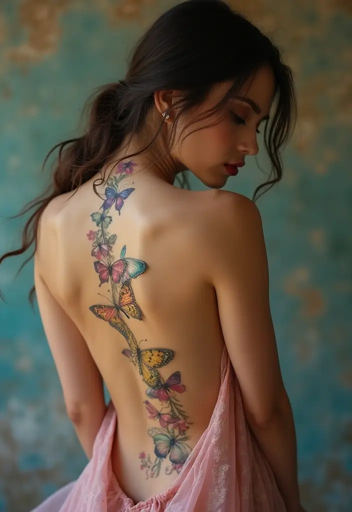If you want a back tattoo that feels soft and feminine, a watercolor butterfly with flowers along the spine may fit your style.