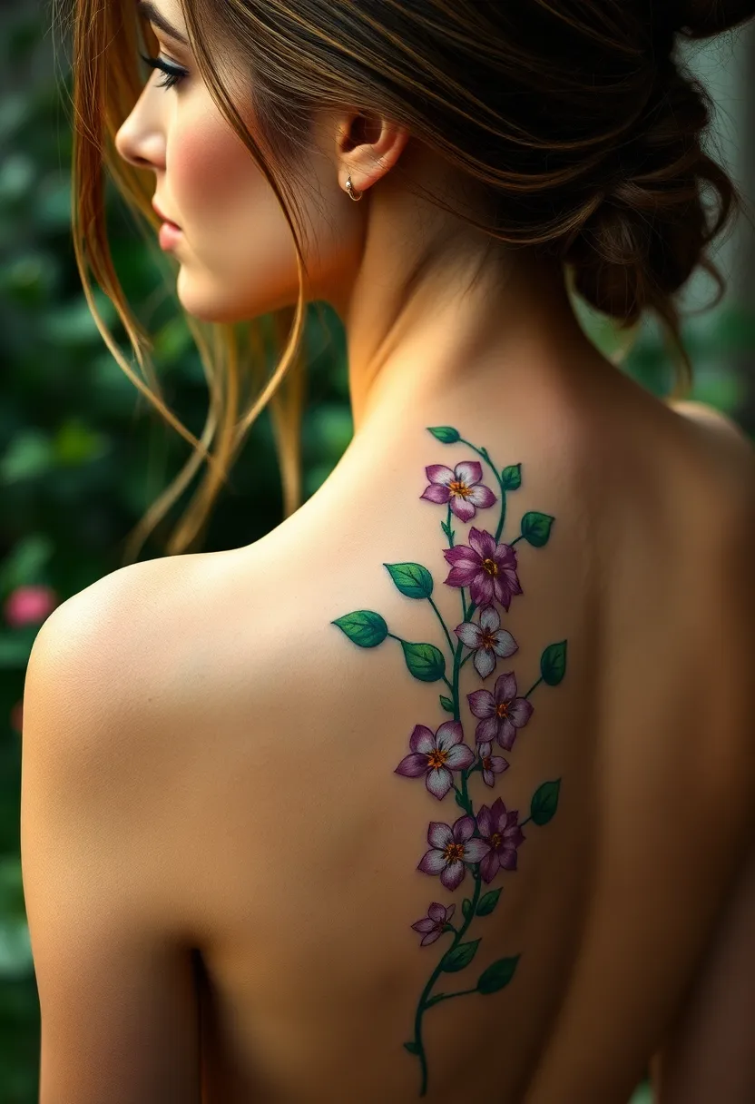 If you want a back tattoo that feels alive, a vine design is a great choice. It can start near the shoulder blade and wind down your spine, following your natural curves. Leaves and blossoms line the stem, creating a gentle, flowing look.