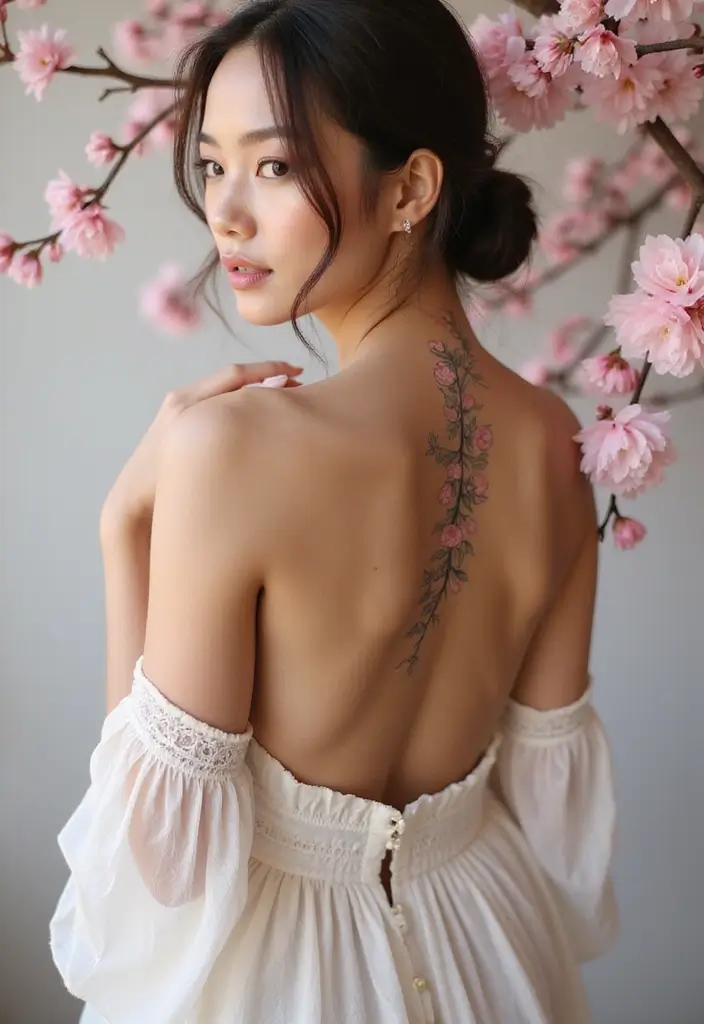 Plan the layout with your artist. Start higher on the back, then let the bouquet drift downward in a natural path. Size should fit your back length and how you usually wear tops and dresses.