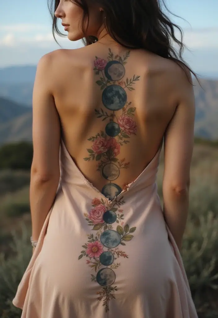 You want a design that feels soft and timeless. A moon phase tattoo along your spine fits that need. It flows with your body and looks rustic when paired with floral accents.