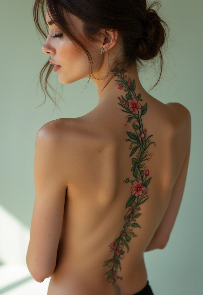 Here is why a vine works well on the spine. It speaks to growth and life. It mirrors the back’s natural lines, giving a seamless feel. You can make it truly yours with colors, flowers, and tiny creatures.