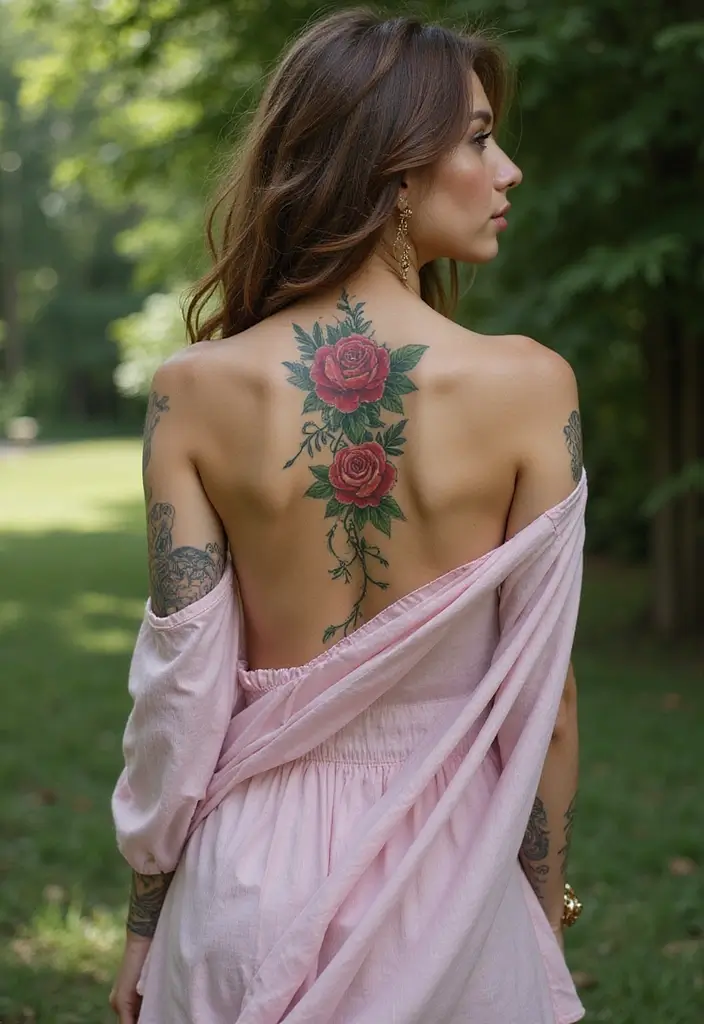 If you want a spine tattoo that feels cozy and country, this design fits. It pairs classic roses with twisting vines for a simple, rustic look you can wear every day. The roses sit along the center of the spine, and the vines wrap around the bones, tracing your natural curves. The result moves with you and stays readable as you bend and stand.