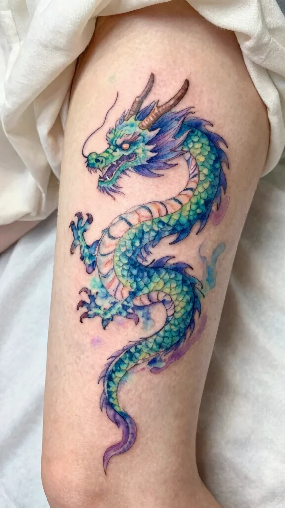 If you’re looking to add a splash of color to your body art, a watercolor dragon tattoo might be just what you need. This design merges artistic flair with the fierce energy of dragons, creating a mesmerizing effect. The soft, flowing hues of blue, green, and violet evoke a dreamlike quality that captivates anyone who sees it. You’ll love how this vibrant tattoo reflects creativity and freedom, making it a unique statement piece.