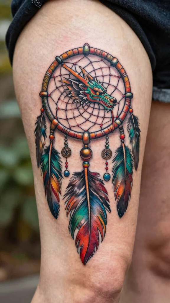 Combining a dreamcatcher with a dragon creates a captivating blend of cultures and meanings. Dreamcatchers symbolize protection and good dreams, while dragons embody strength and power. This design typically features the dragon entwined with the dreamcatcher, resulting in a visually stunning and meaningful tattoo. The thigh serves as an excellent canvas, allowing both elements to shine beautifully.