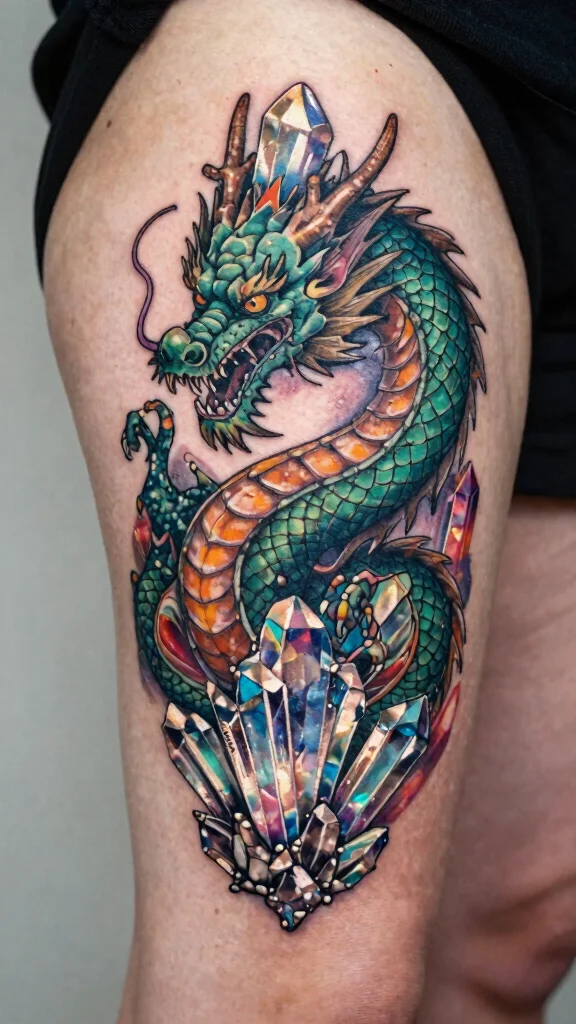 As you consider a dragon and crystal tattoo, choose crystals that resonate with you, whether for their beauty or energetic properties. Discuss how the dragon interacts with the crystals to add depth, and think about incorporating shading or highlights to enhance the tattoo’s visual appeal.