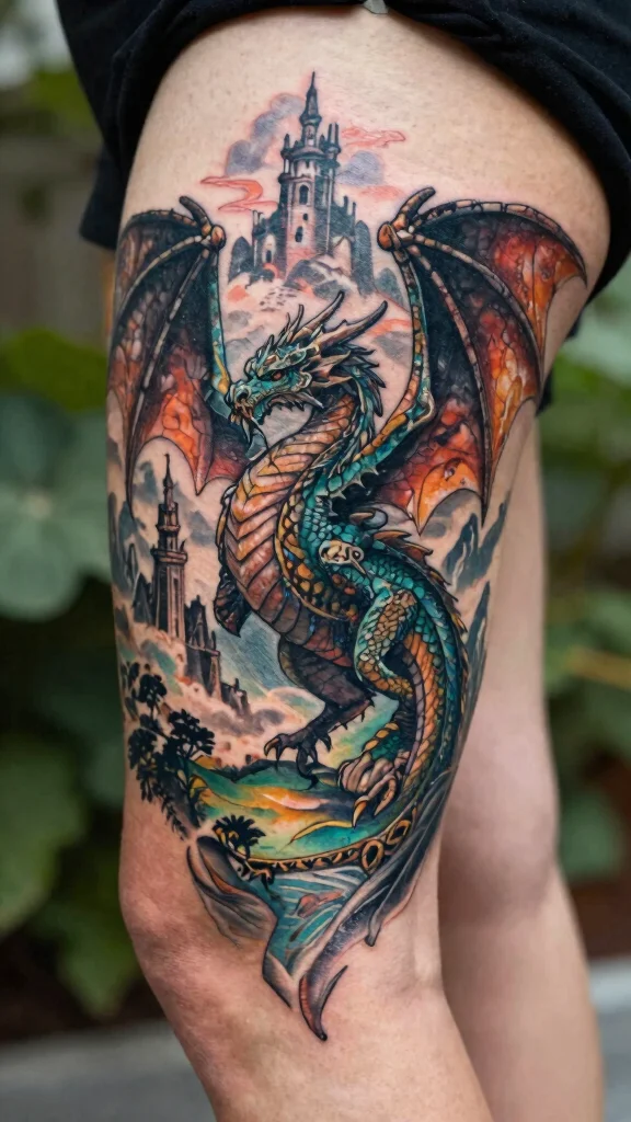 A fantasy dragon scene tattoo can turn your thigh into a canvas for storytelling, often depicting a dragon in its enchanting habitat. This can include mountains, castles, or mythical landscapes, bringing an entire world to life through your body art. These tattoos are rich in detail, showcasing the dragon’s majesty while creating an engaging visual narrative.
