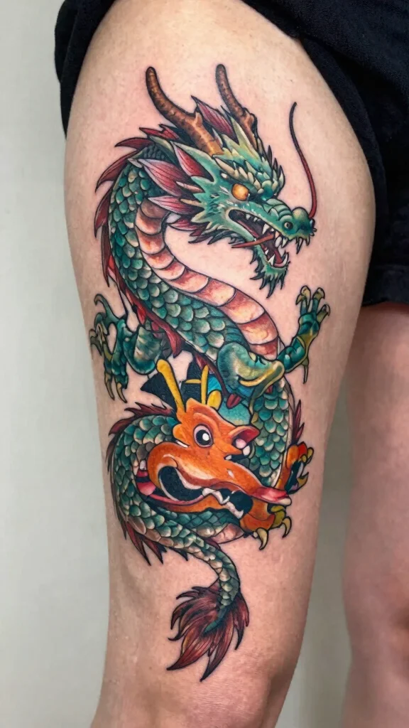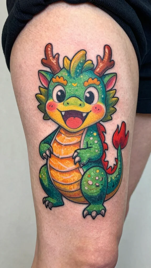A whimsical cartoon dragon tattoo brings a playful and lighthearted vibe to body art, perfect for those who enjoy fun designs. These tattoos often feature exaggerated expressions, bright colors, and humor, making them a delightful choice for showcasing personality. The thigh is an ideal canvas for this cartoon dragon, allowing ample space to express its playful character.