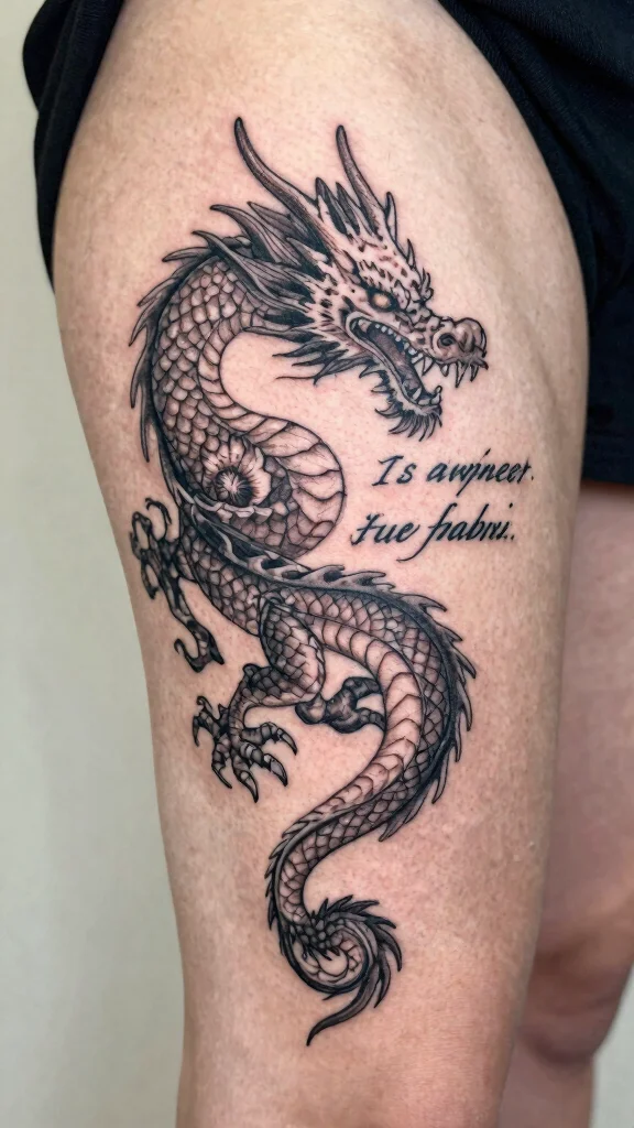 Incorporating a meaningful quote into a dragon tattoo adds depth and personal significance to your design. The quote can express themes of empowerment, resilience, or any other sentiment that resonates with you, beautifully paired with the fierce imagery of the dragon. Placing this tattoo on your thigh allows for a larger font size, ensuring the quote is clear and impactful while maintaining aesthetic harmony.