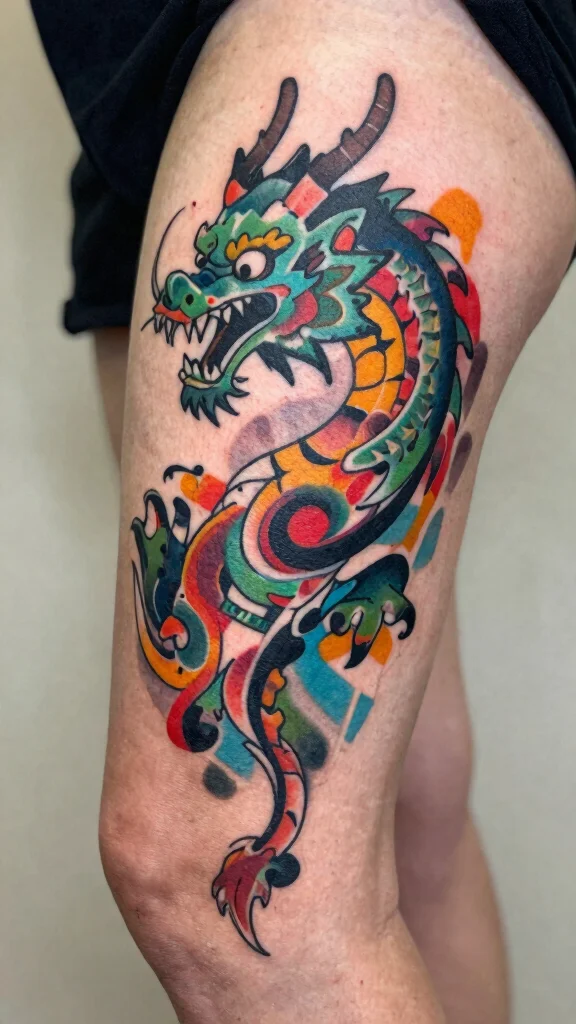Abstract dragon tattoos are perfect for those who appreciate modern art and unique interpretations of traditional themes. These designs often feature bold shapes, vibrant colors, and unconventional patterns that evoke a sense of movement and energy. The thigh is an excellent location to showcase this freeform style, allowing your creativity to shine.