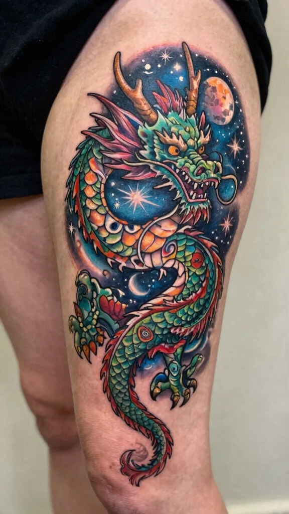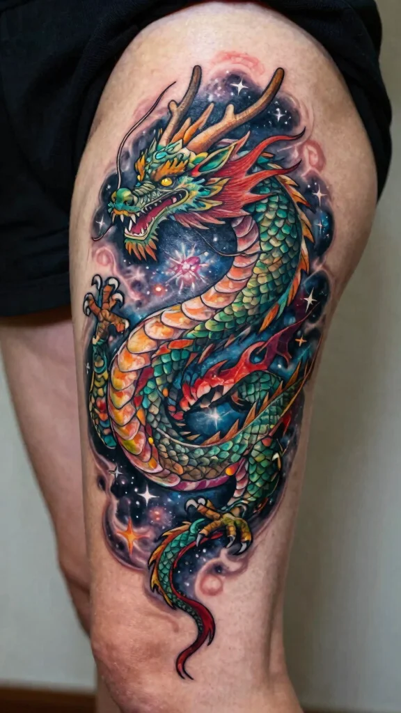 A celestial dragon rising design captures both the beauty of dragons and cosmic themes. This tattoo often features a dragon ascending through a backdrop of stars, planets, or nebulae, embodying ambition and adventure. The dynamic nature of this design allows for expressive artistry that looks stunning on your thigh.