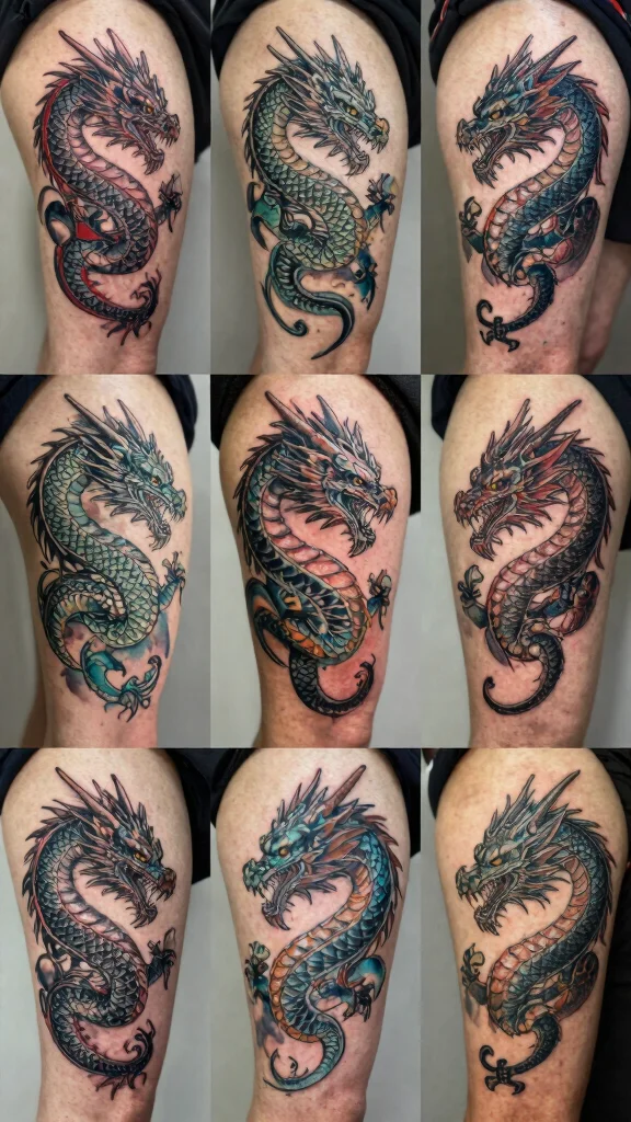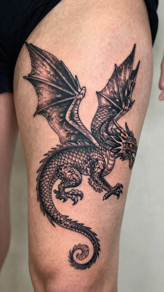 Check artist portfolios for dragon tattoo designs and mythical creature tattoos that suit your style. Ask about line thickness and healing, as fine lines can blur over time on the thigh.