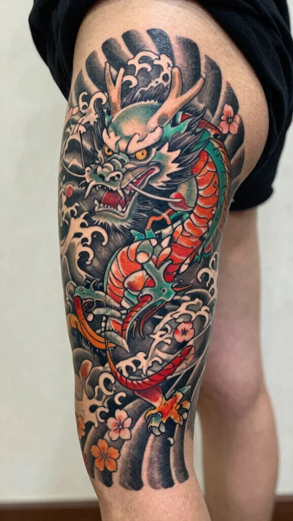 Think about the focal point—the dragon’s head, eyes, or tail—and whether you want it to wrap around or stay on the outer thigh.