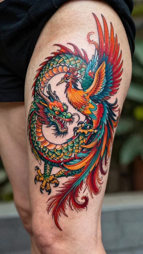 A dragon and phoenix tattoo beautifully symbolizes the balance of power and grace, making it a sought-after design. In various cultures, dragons embody strength while phoenixes represent rebirth and renewal. This combination creates a vibrant visual narrative, with the dragon often depicted in bold colors, while the phoenix complements it with soft, flowing elements. Your thigh provides ample space to highlight both creatures stunningly.