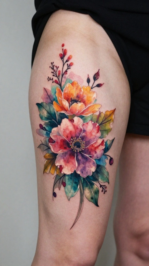 Watercolor tattoos infuse your skin with vibrant colors, resembling a beautiful painting rather than traditional ink. These designs evoke movement and fluidity, mimicking the soft edges of watercolor art. When done on the front thigh, they create a striking visual impact, blending bright hues seamlessly.