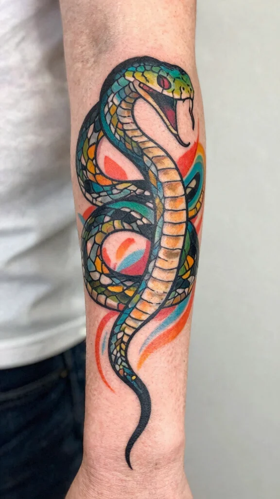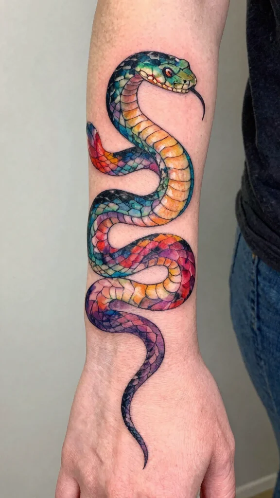 A watercolor snake tattoo celebrates color and artistry, making each piece unique to the wearer.