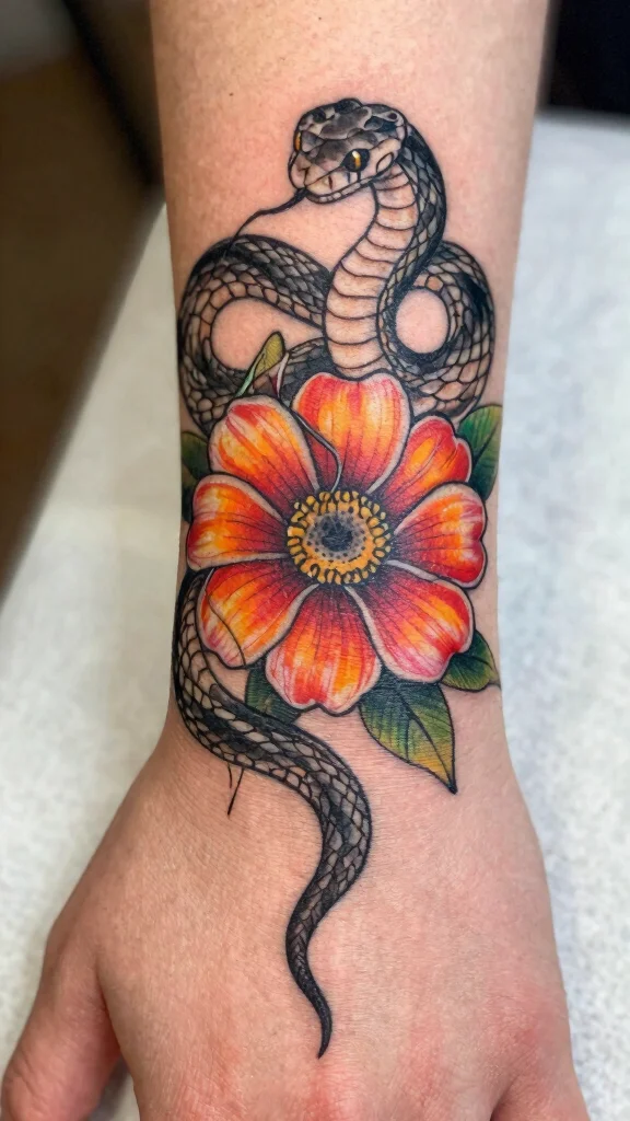 A snake entwined around a blooming flower can result in a visually striking tattoo that feels lively and vibrant.