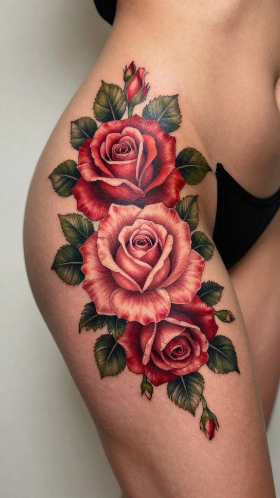 If you’re looking for a timeless tattoo that embodies romance, the enchanting rose bouquet is perfect for you. Placed on the hip thigh, it becomes a breathtaking piece that combines beauty with personal significance. With vibrant colors and varied shades, this design captures the essence of love and passion while allowing you to express your emotional side.
