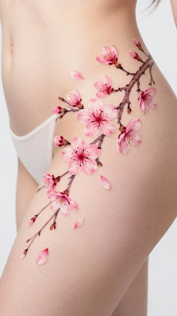 Cherry blossoms symbolize beauty and the fleeting nature of life, making them a lovely choice for a hip thigh tattoo. Their delicate appearance conveys elegance and can connect you to cultural heritage.