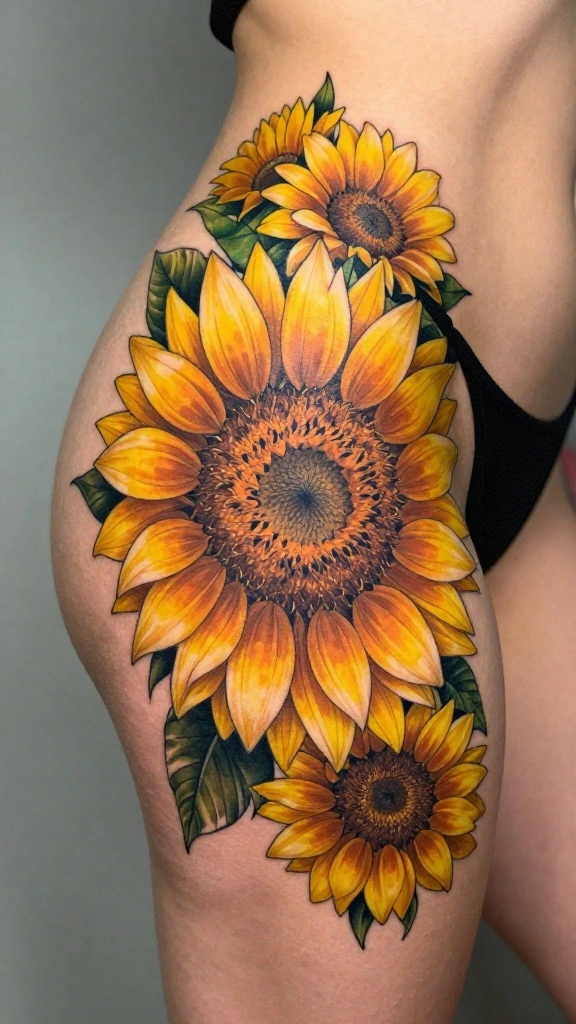 Sunflowers are symbols of positivity and warmth, making them an uplifting tattoo choice. When inked on the hip thigh, they create a striking focal point that radiates joy and brightness.