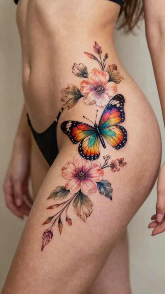 Butterflies symbolize transformation and beauty, making them a perfect complement to floral tattoos on the hip thigh. This enchanting design embodies grace and elegance, capturing the essence of personal growth.
