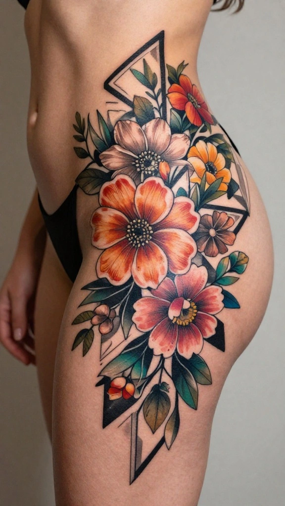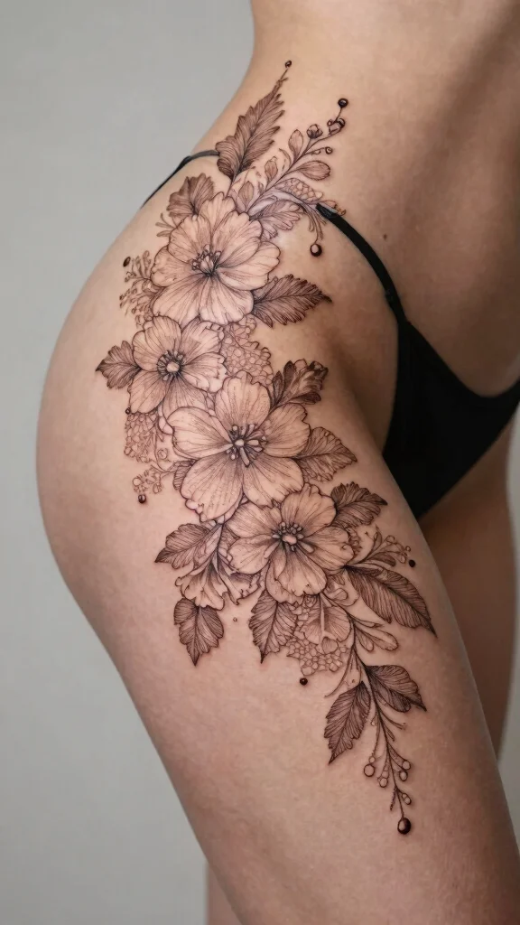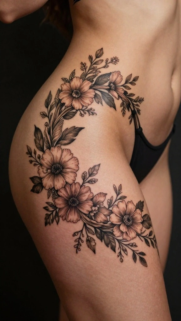 Hip thigh tattoos for women offer a beautiful canvas for self-expression, particularly through floral designs that capture femininity and individuality.