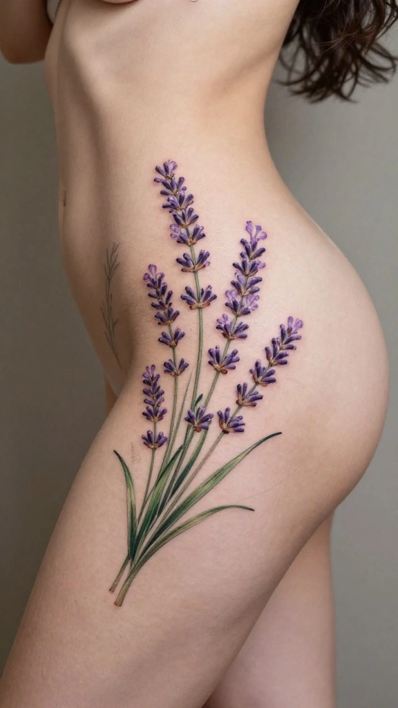 Lavender tattoos are not only stunning but also carry meanings of peace and healing. When designed as a hip thigh tattoo, they create an enchanting look that is calming and serene.