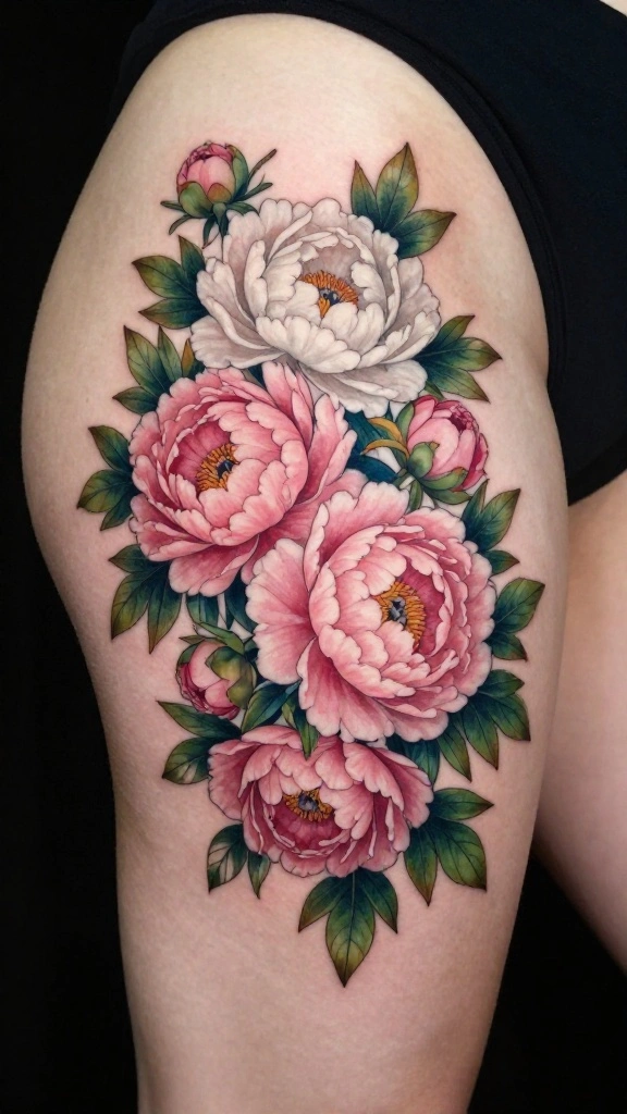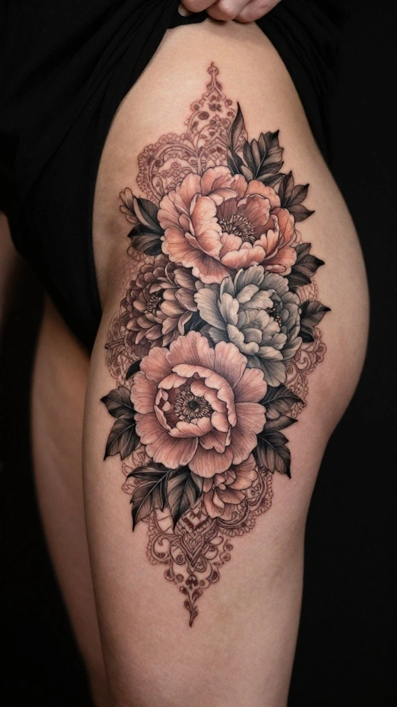 Peonies are cherished for their lush blooms and symbolism of prosperity, making them an excellent choice for a hip thigh tattoo. A peony bouquet creates a stunning focal point that showcases elegance and beauty.