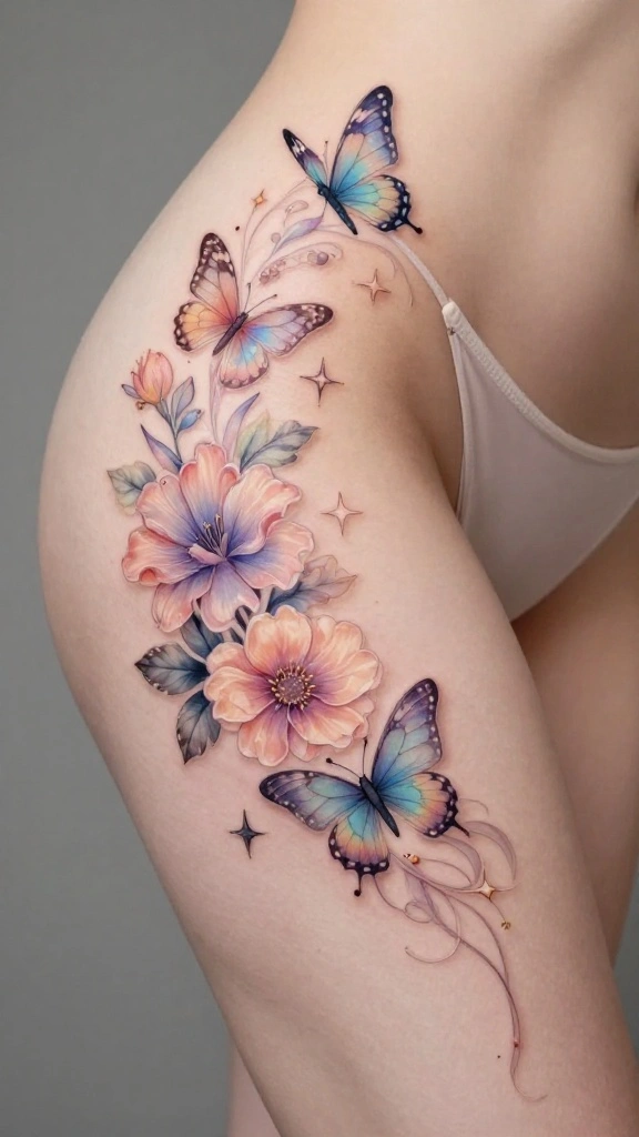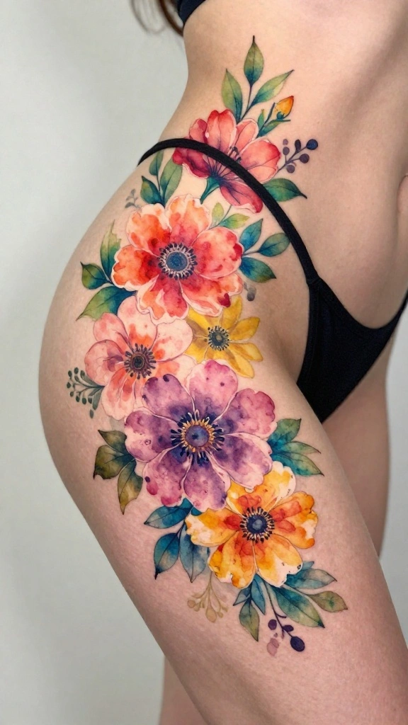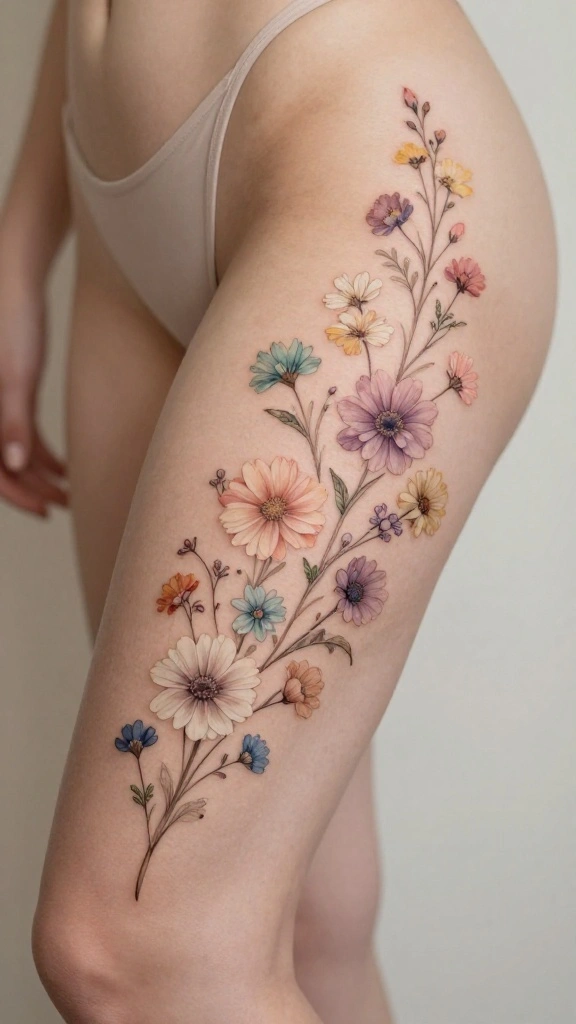Consider how the flowers can cascade down the thigh for a fluid, natural look. Opting for soft pastel colors can enhance the gentle and feminine vibe of the tattoo.