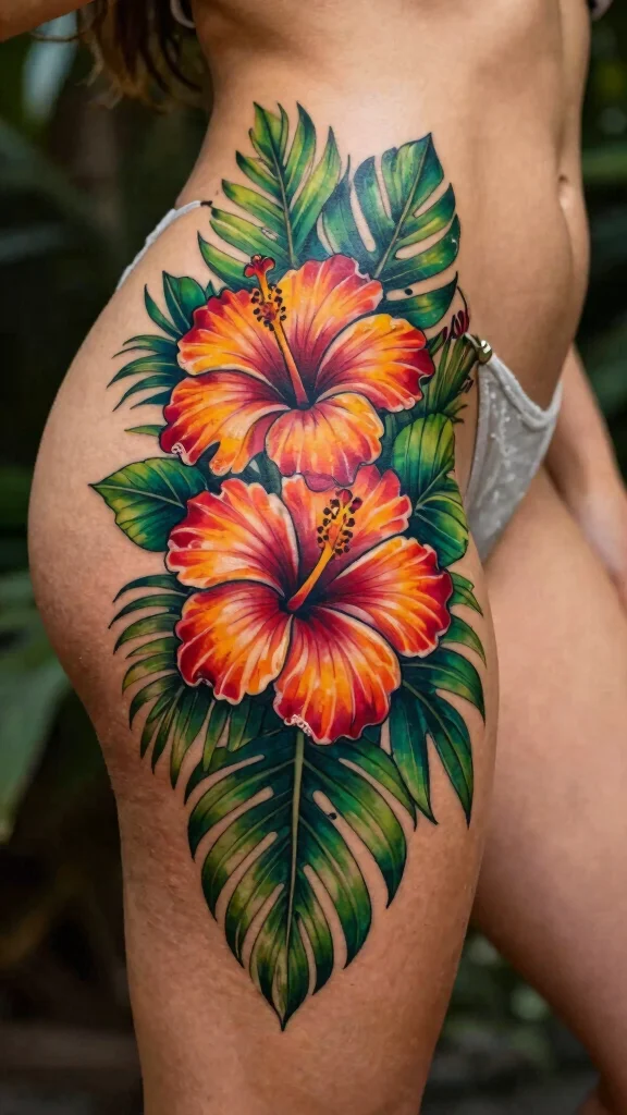 Tropical tattoos can uplift your spirit, serving as a reminder of joyful travels and sunny days. Using bright, saturated colors will make the flowers truly pop on your skin.