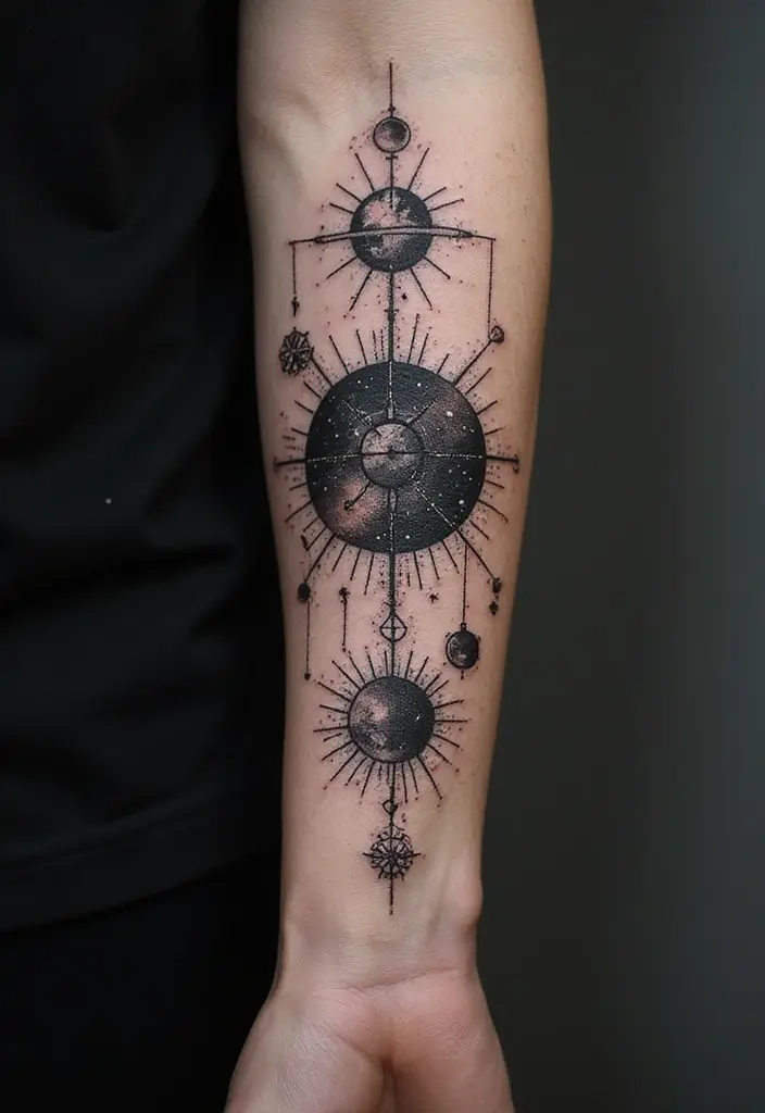 Cosmic tattoos can represent exploration and wonder, utilizing the inner forearm’s space for detailed designs.
