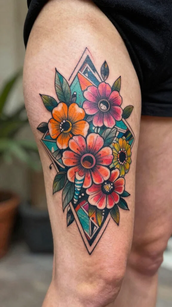 The geometric floral tattoo merges nature with modern artistry, producing a unique and stylish look. This design incorporates floral elements within geometric shapes, giving a contemporary twist to traditional floral tattoos. Placed on the lower thigh, it makes a bold yet refined statement piece.