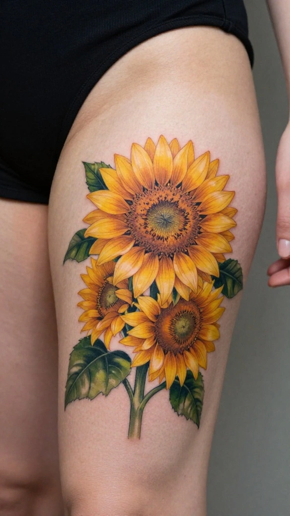 A simple sunflower tattoo is a cheerful option that radiates positivity. Known for symbolizing happiness, sunflowers can be a delightful addition to your lower thigh collection. This design can be minimalistic with just the outline or filled with vibrant yellows for a more striking effect.