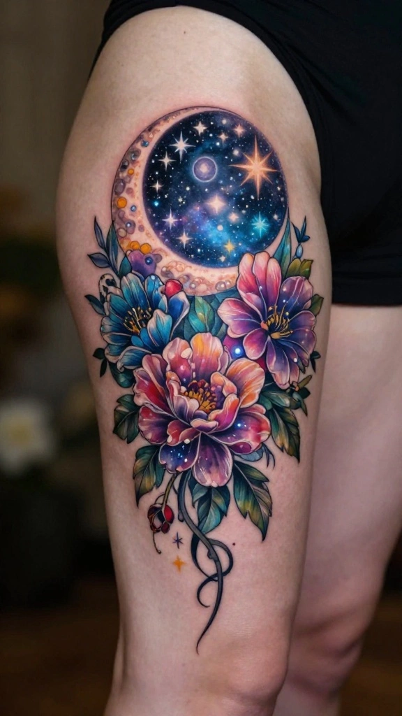 A starry night floral tattoo beautifully combines flowers with celestial elements, creating an enchanting design. This tattoo blends floral motifs with stars and moons, symbolizing dreams and aspirations. Positioned on the lower thigh, it adds a whimsical touch to your body art collection.