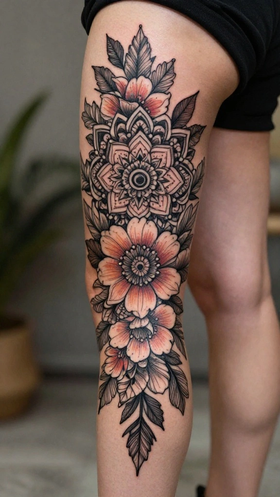A floral mandala tattoo combines intricate details with floral elements, creating a stunning design. Mandalas symbolize balance and harmony, making them a powerful choice for body art. Placed on the lower thigh, this tattoo can be bold or soft, depending on your style preferences.