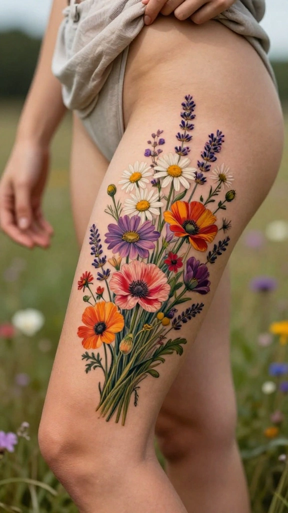 If you cherish the beauty of nature, a wildflower bouquet tattoo could be your perfect fit. This design showcases a variety of flowers, each symbolizing unique characteristics, from daisies to lavender. It reflects your individuality and love for the outdoors, while its placement on the lower thigh makes it perfect for summer outfits.